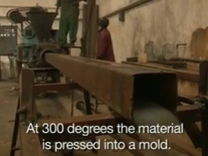 Die Tüten werden in der Fabrik zerkleinert, erhitzt und bei 300°C zu Recycling-Zaun- pfählen verpresst. Die 100 Zaunpfähle, die Evans Githinji täglich in seiner Fabrik produziert reichen nicht aus, um die Nachfrage zu befriedigen.